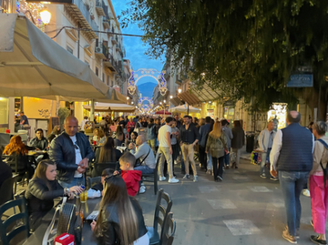 We spent most of the day just wandering the streets. Many are nominally pedestrian-only (watch out for motor scooters) and filled with people. In fact, they were filled with people all day. The streets also hold buskers and swap meet vendors, contrasting dramatically with the elegant stores. For lunch we had the local arancini, rice balls filled with meat or vegetables or cheese or sweets. Later we found a traditional open-air market. The shops were closed but there were many food vendors with enticing or intriguing selections. Whole squid anyone? We were sorry we had already had a large lunch and couldn’t try anything. Later gelato and then a seafood dinner so dramatically presented that I needed to take a picture of it. (How tacky!) Then we joined the passeggiata, listened to music and admired the light displays above the streets.